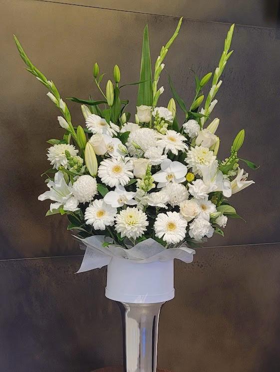 Pure love is a graceful all white arrangement symbolising purity, peace, and everlasting love. Featuring elegant blooms such as lilies, chrysanthemums, disbuds, roses, gerberas, and gladiolus, this design makes a timeless tribute for sympathy, remembrance, or special occasions where a touch of serenity is desired. Beautifully arranged in a modern box to suit any setting.