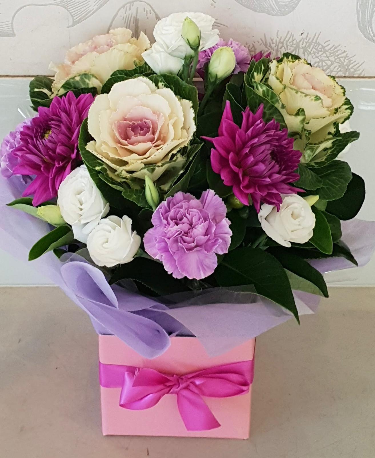 A delicate blend of soft pastels and vibrant blooms, the Janett arrangement exudes charm and grace. This elegant display features creamy ornamental kale, mauve carnations, lush white lisianthus, and striking plum dahlias, all beautifully presented in a pastel pink gift box