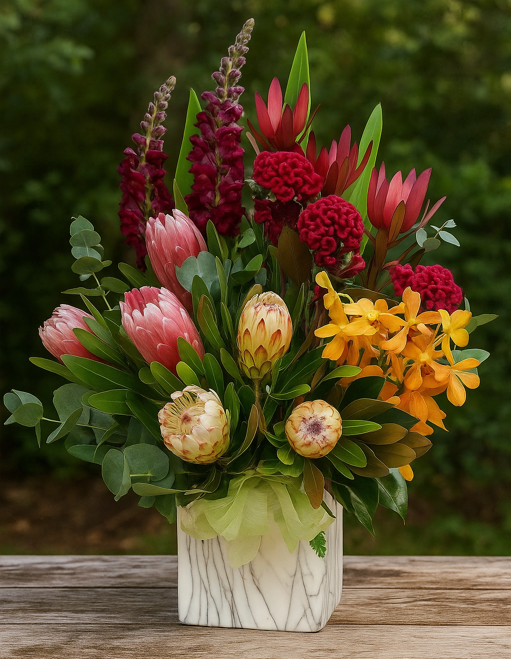 This elegant arrangement bursts with texture and colour, featuring striking pink proteas, golden orange bands orchids, and velvety burgundy celosia, complemented by lush greenery and sculptural leucadendrons. Presented in a modern ceremony pot, it blends native Australian beauty with tropical warmth, perfect for any occasion where sophistication and natural charm are desired.