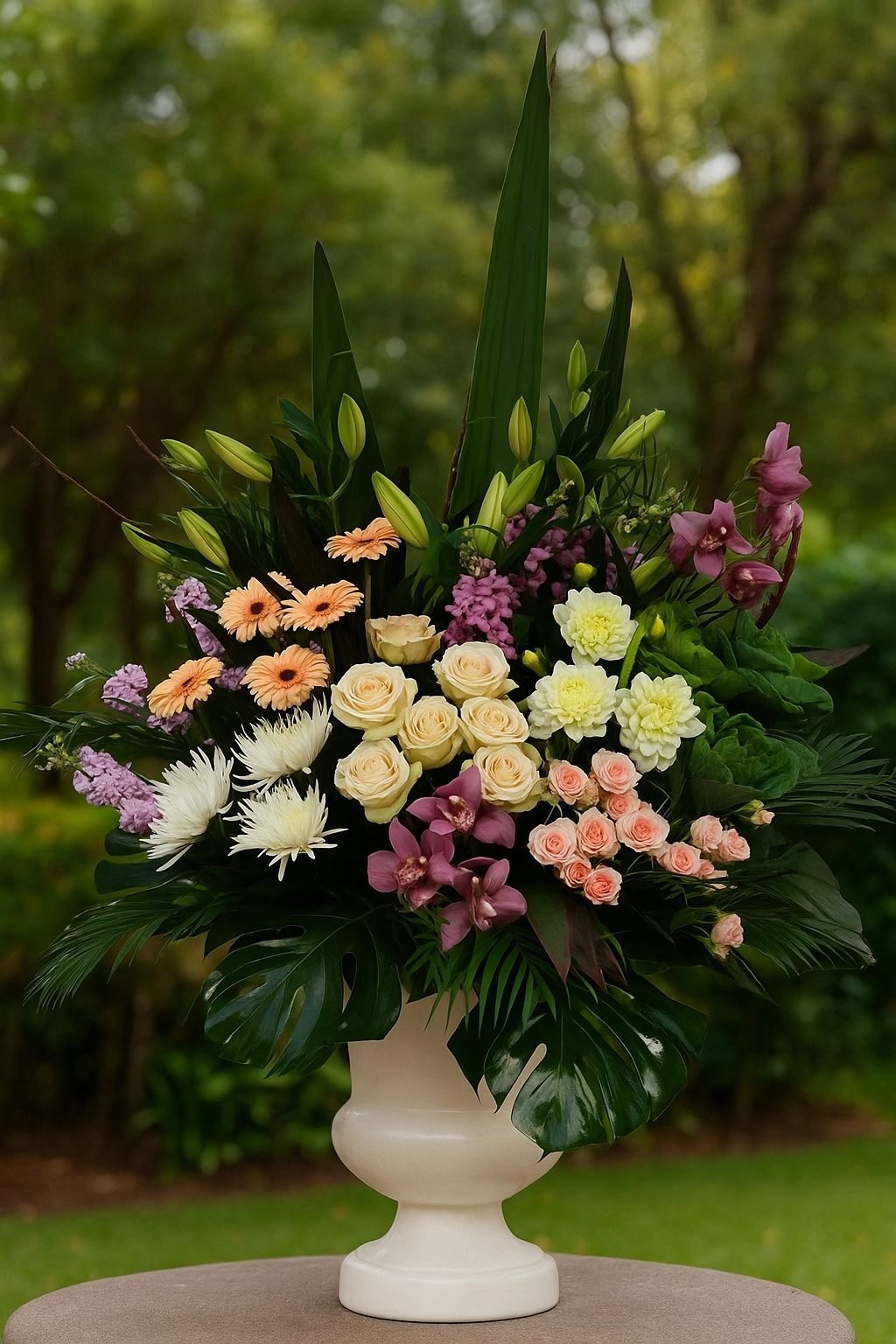 A bold and elegant arrangement designed to stand out. Featuring soft pastels, premium blooms, and lush tropical foliage, this grand display creates an unforgettable presence for funerals, ceremonies, or any moment that calls for a powerful expression of love and respect.
