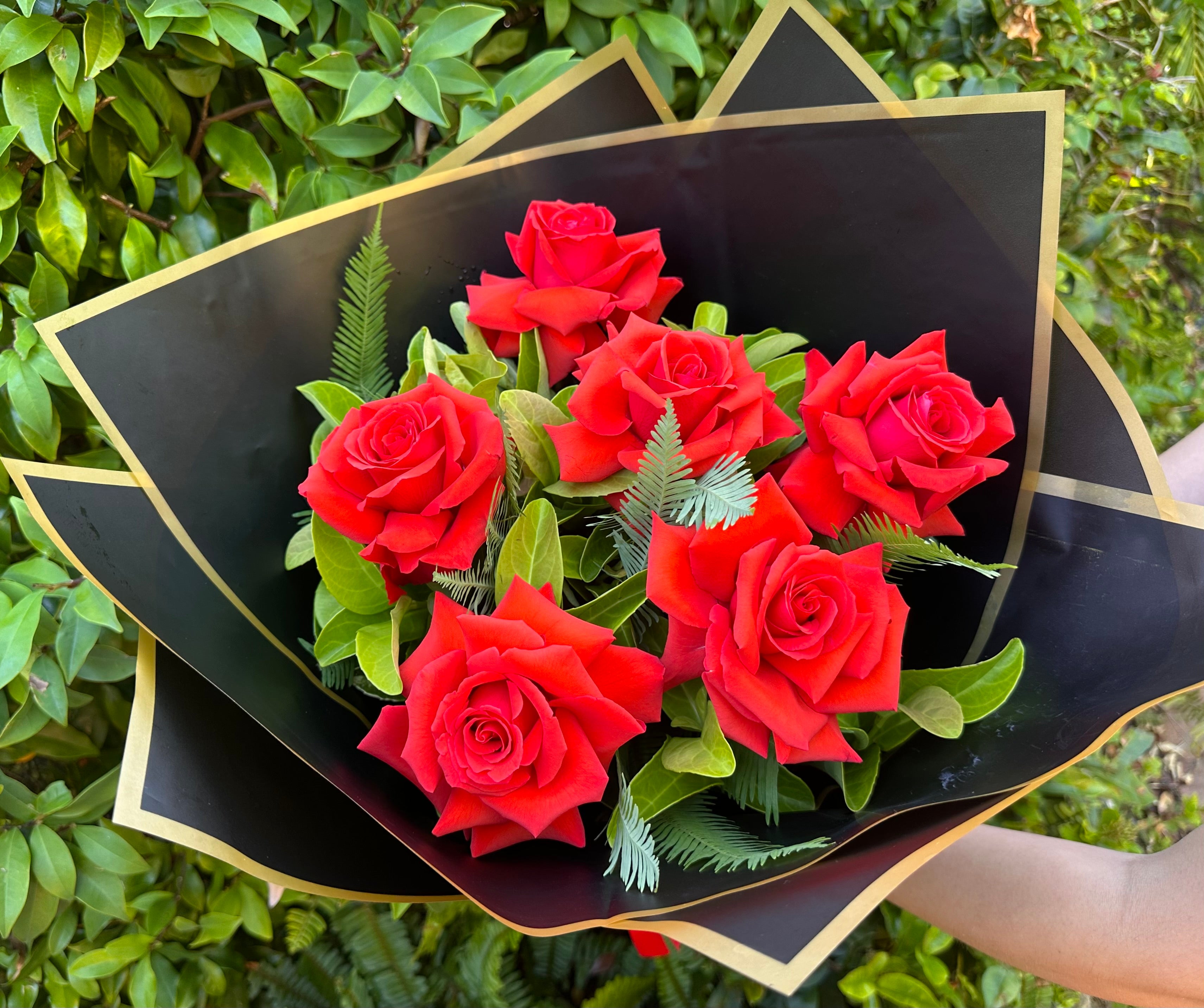 A striking arrangement of luxurious reflexed red roses nestled among fresh greenery and wrapped in elegant black and gold. Midnight Romance is bold, passionate, and irresistibly romantic. The ultimate gift for a love that runs deep