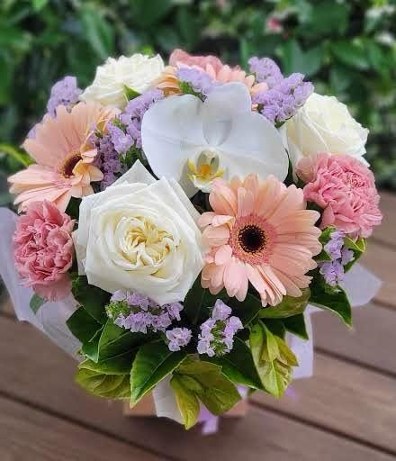 Soft, elegant, and beautifully balanced, Britney is a charming arrangement that captures both warmth and sophistication. Featuring a stunning phalaenopsis orchid as its centrepiece, this design is complemented by delicate white roses, blush gerberas, pink carnations, and touches of lilac statice, all nestled in lush greenery. Perfect for any occasion.