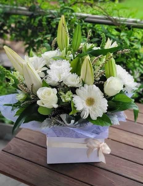 Elegant and timeless, our White Magic Box Arrangement features white lilies, roses, chrysanthemums, and gerberas. A beautiful mix symbolising purity and peace. Perfect for expressing sympathy, love, or simply adding a touch of calm elegance to any space.
